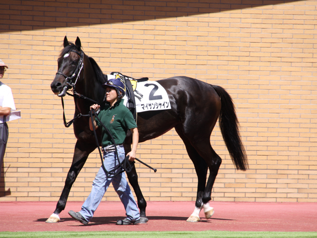 「私のひなた」そんな日本語訳よりも、名曲「You Are My Sunshine」の歌い出し「♪ユーアーマイサンシャイン、マイオンリーサンシャイン……」という歌詞が頭に思い浮かぶことだろう。「貴方は私の太陽、たったひとつの太陽」そんな馬に育ってくれることを願って。母の名からの連想。 |